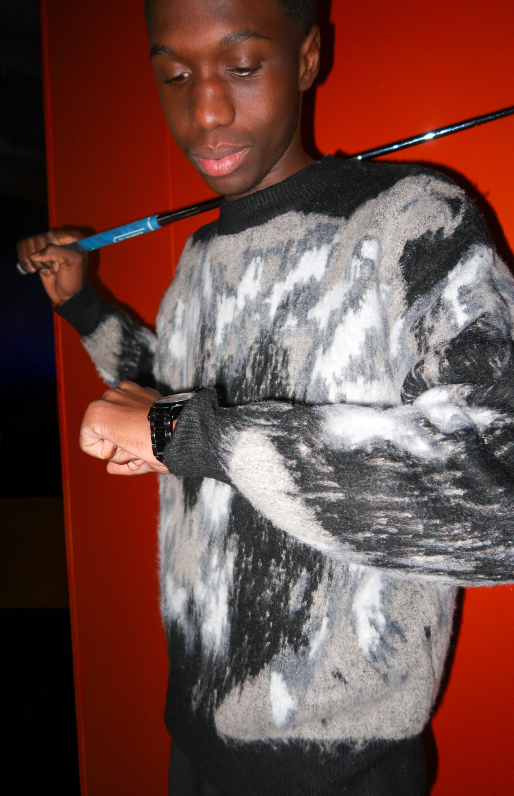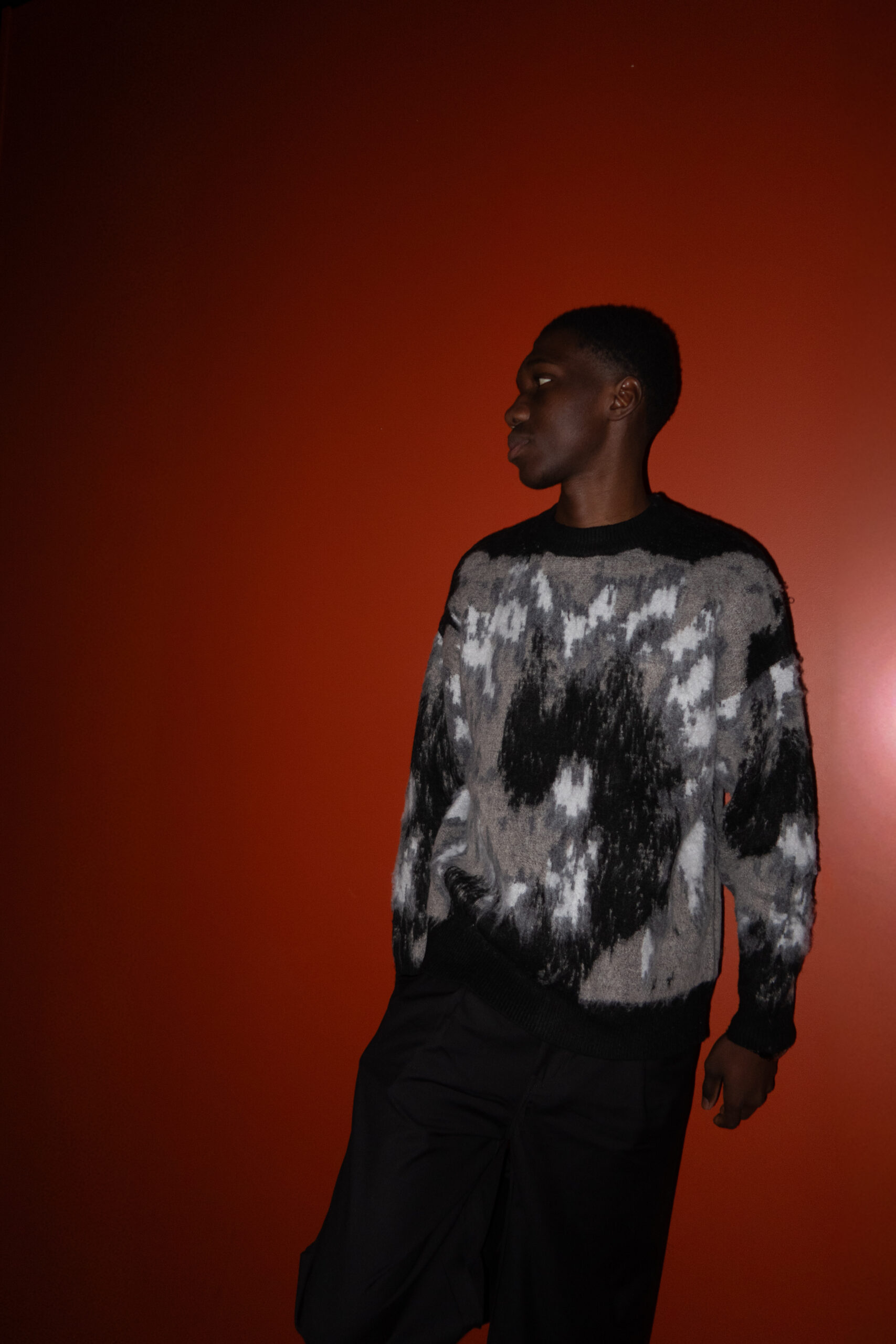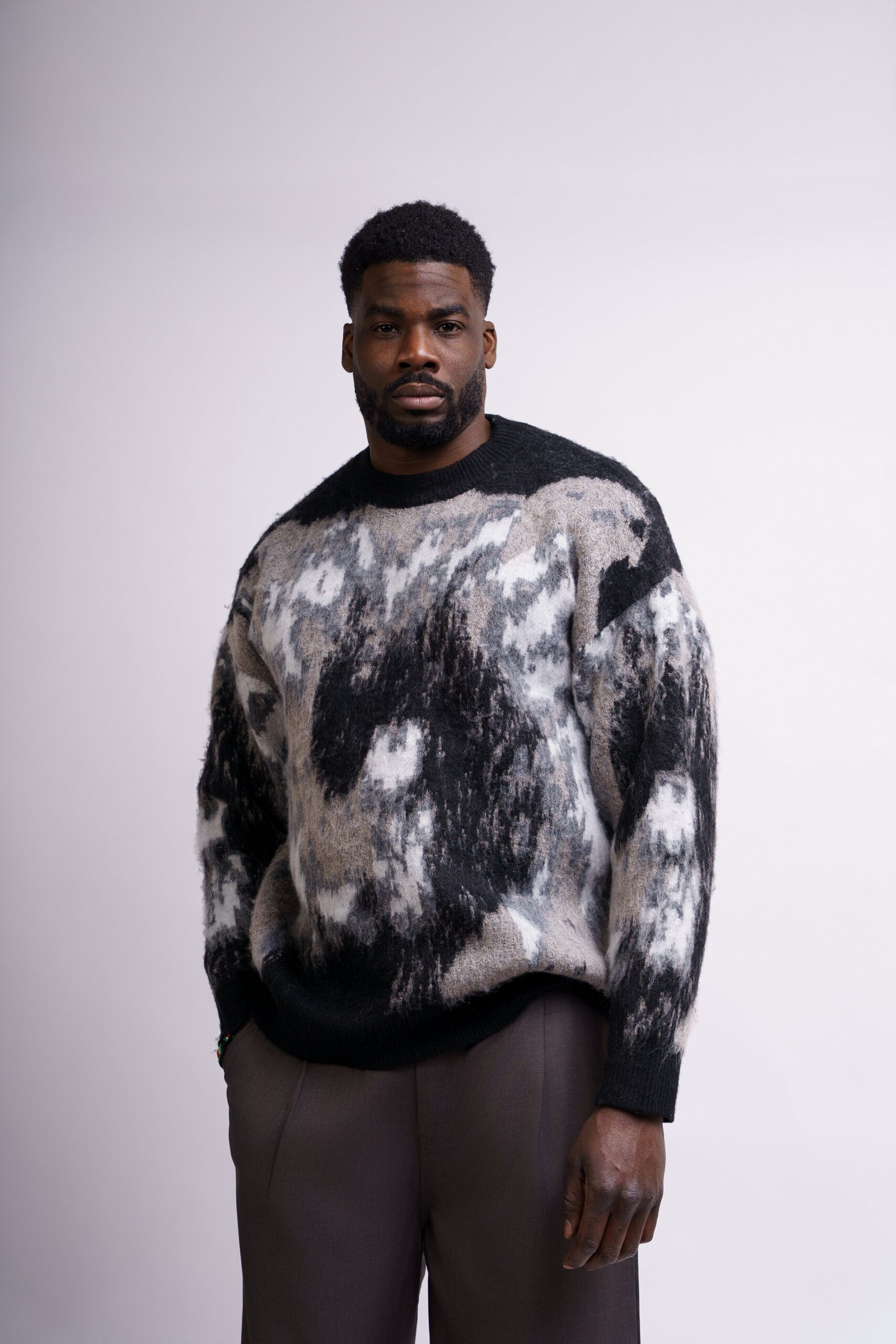 Pull col rond à manches longues avec dégradé noir/gris. Le genre de pièce qui transforme un jean basique en tenue travaillée. Ni trop chargé, ni trop fade.